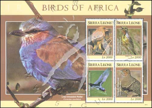 非洲鸟类,金翅雀、橘红长爪鹡鸰、家燕及纳马夸沙鸡小版张(4票)