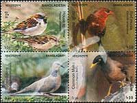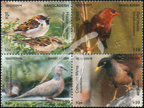 孟加拉鸟类,家麻雀、红梅花雀、朱颈斑鸠及家八哥4联