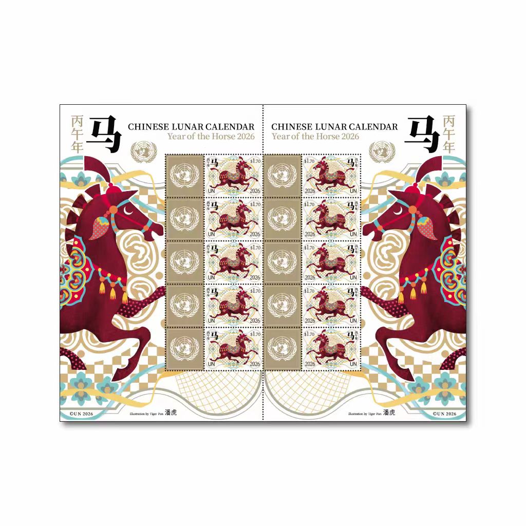 联合国2026年生肖马邮票版张含10票十10附票(联合国徽志)