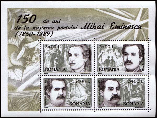 罗马尼亚诗人米哈伊·埃米内斯库(1850-1889)诞生150周年,肖像及诗作场景小全张(4票)