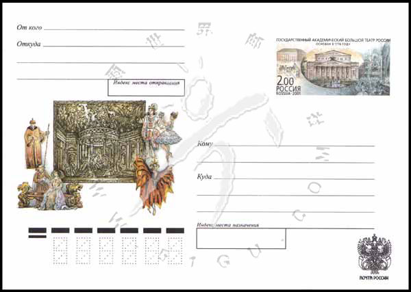 莫斯科大彼得罗夫大剧院225周年,现存及1780年剧院建筑、戏剧及芭蕾舞表演等纪念邮资封1全