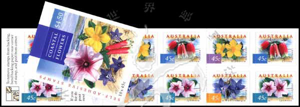 澳大利亚的大自然系列四—海岸花卉,攀缘纽扣花、厚藤及牵牛花等不干胶自贴小本票(10票)
