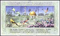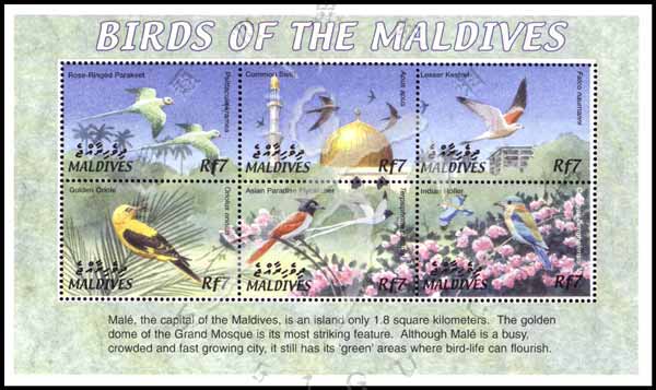 红额绿鹦鹉、楼燕、金黄鹂、寿带等鸟类小版张(6票,印有马尔代夫首都马里的英文简介)