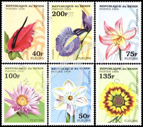 Sc#768-773 花卉:Dracunculus vulgaris(40f)、水仙(50f)、孤挺花(75f)、好望角睡莲(100f)、蒿子竿(135f)、丹吉尔鸢尾(200f) 6全