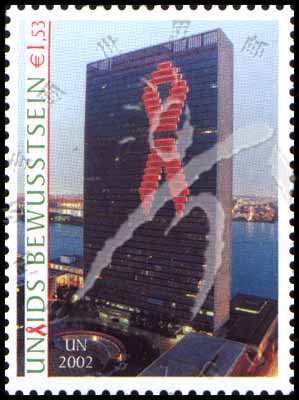 世界爱滋病日,联合国纽约总部大楼用红色灯光拼合成防治爱滋病的标志—红丝带1全
