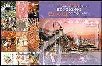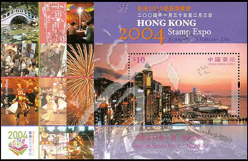 2004年香港邮票博览会通用邮票旅游一号—香江夜景,传统民族舞蹈、商店、游人等小型张