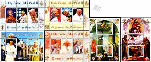 教皇约翰·保罗二世登基25周年,不同场合照片、教堂及宗教画等6枚小全张(共16票)