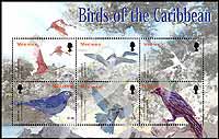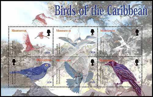 加勒比海鸟类,玫瑰琵鹭、笑鸥鸏、白尾鸫、裸眼高喉翡翠蜂雀、安第列群岛白头翁小版张(6票)
