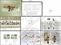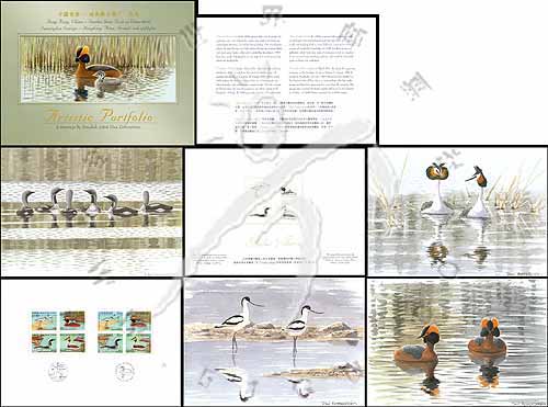 瑞典与香港联合发行湿地水鸟,反咀鹬、角鸊鷉、黑喉潜鸟和凤头鸊雕刻版豪华邮折(8票+黑墨压印雕版+雕刻师介绍、斯拉尼亚雕刻)