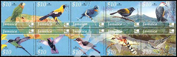 加勒比海观鸟大会,徽志、国际鸟盟徽志、黄嘴亚马逊鹦鹉、牙买加拟鹂、牙买加啄木鸟、红嘴长尾蜂鸟及尖头林莺等10联