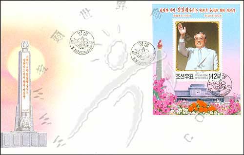 伟大领袖金日成永远和我们在一起,挥手、主题思想塔、金日成广场及花卉小型张首日封