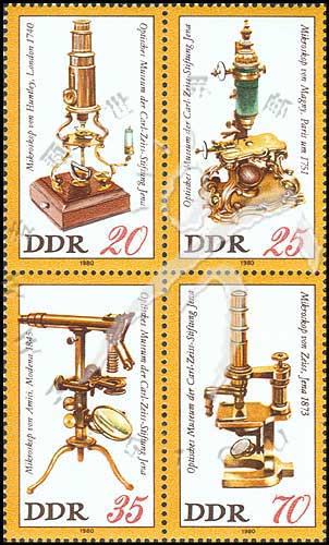 卡尔—蔡斯基金会博物馆藏品,1740年伦敦洪特莱伊公司、1751年巴黎马格尼公司、1845年莫迪纳阿米奇公司及1873年耶拿蔡斯公司显微镜4联