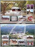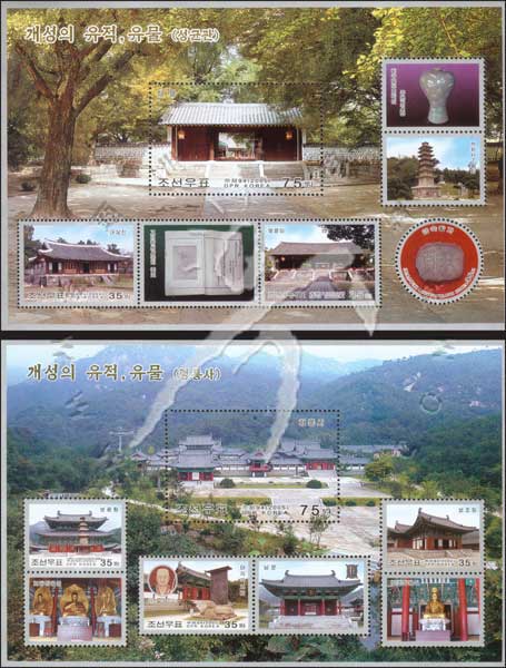 开城历史遗迹系列一,灵通寺及高丽成均馆(又名高丽博物馆)2枚小版张(各7票,其中1枚为圆形票)