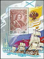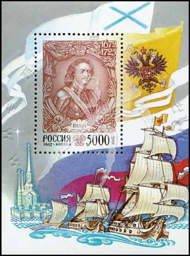 Sc#6411A 俄罗斯历史,彼得大帝(1672-1725)及帆船小型张5000r