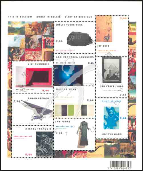 这就是比利时—比利时艺术,艺术家米歇尔·弗朗索瓦《叠罗的手》、让·法布尔《阿格尼斯女神》及耶夫·盖斯《巴黎的学校》等小版张(10票)