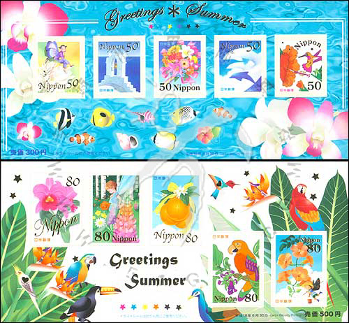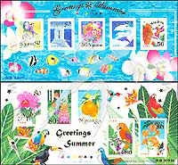 夏季问候邮票,画家永田萌、村居正之、新井苑子、渡边宏及村上勉的作品2枚不干胶自贴小全张(各5票)(我社已售缺)