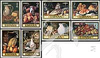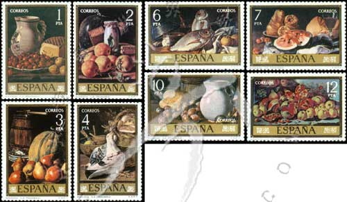 邮票日,门德兹的静物画:罐子、樱桃和李;西瓜、密封罐和桔子;甜瓜和梨;鸽子;鱼和桔子;面包和酒杯;李子和罐子;苹果和石榴等8全