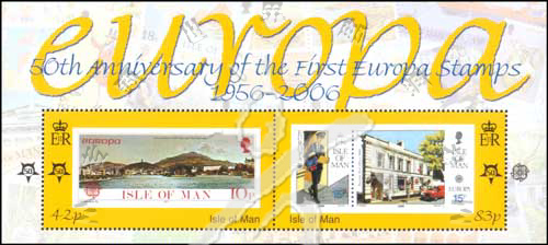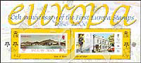 欧罗巴邮票发行50周年,欧洲邮联徽志、1977年发行的欧罗巴邮票拉姆齐风光、1990年发行的欧罗巴邮票邮递员及拉姆齐邮局小全张(2票)