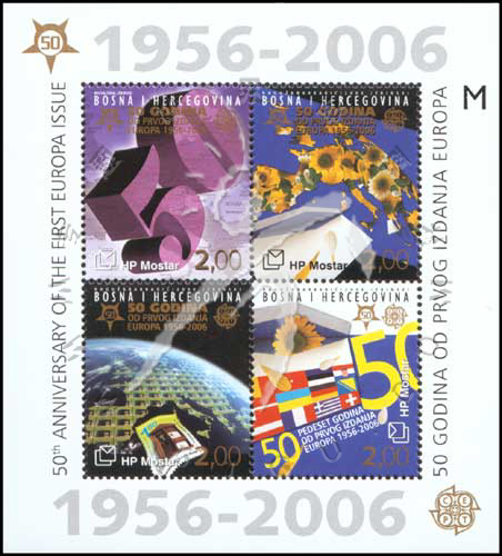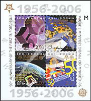 欧罗巴邮票发行50周年,欧洲邮联徽志、数字“50”、地球及国旗等小全张(4票)