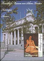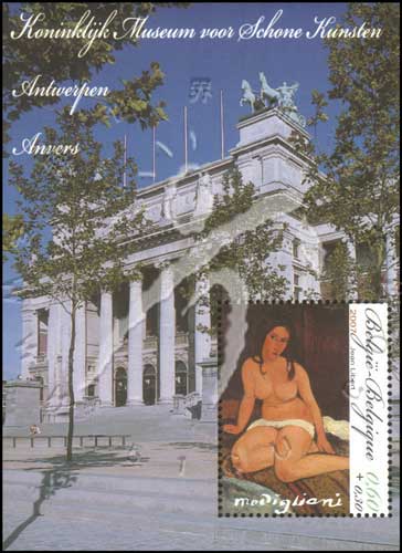 集邮推广系列,意大利画家莫迪利阿尼的绘画《坐姿裸女》及收藏该画的KMSK博物馆外景附捐票小型张
