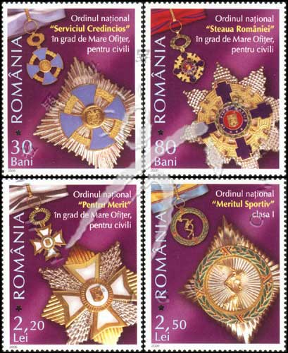 罗马尼亚勋章,“忠诚”勋章、“罗马尼亚之星”勋章、“功绩”勋章及“一级体育功绩”勋章4全(带镂空五角星图案)