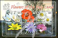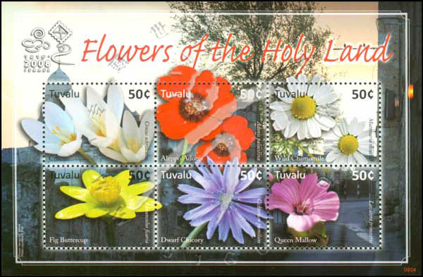 复活岛花卉,番红花、金盏花、雏菊、金凤花、菊苣及花葵加盖以色列2008世界邮展徽志小全张(6票)