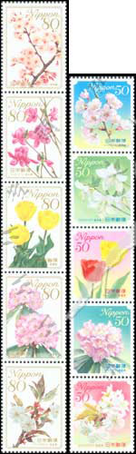 故乡邮票—都道府花卉三,染井吉野樱花、八潮杜鹃、郁金香、石南及奈良八重樱10全