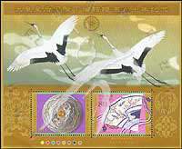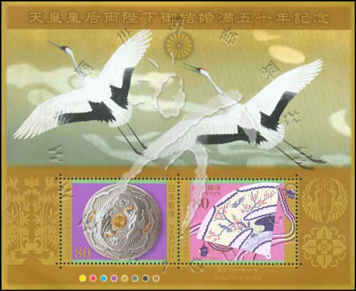 日本明仁天皇和皇后结婚50周年,糖果盒、桧扇及鹤小全张(2票)