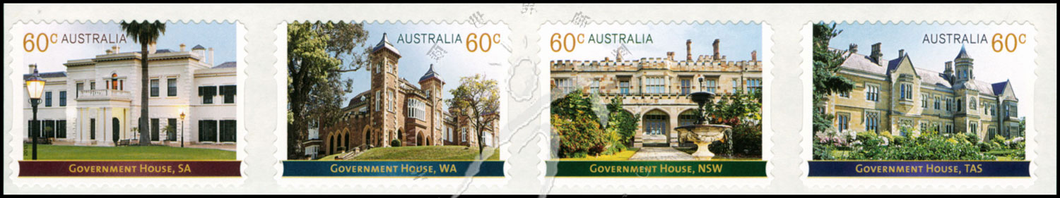 建筑—总督府,南澳大利亚州、西澳大利亚州、新南威尔士州及塔斯马尼亚州的总督府不干胶自贴票4联