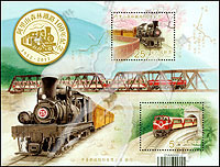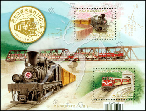 阿里山森林铁路百年,樱花道上的蒸汽火车及1号隧道口的柴油火车小全张(2票)