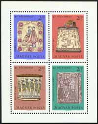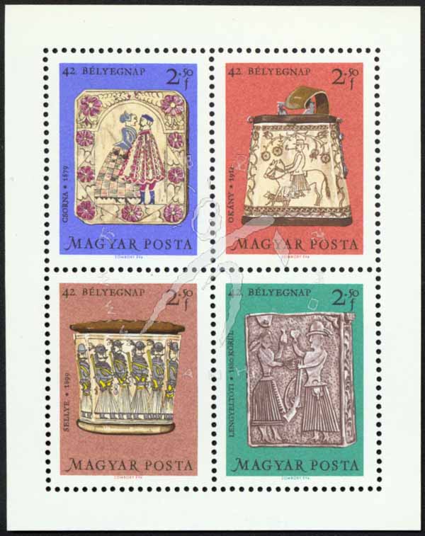 第42届邮票日—匈木雕艺术品,1879年克苏尔纳木版、1914年奥加尼大啤酒杯、1899年西里伊圆形有柄水罐及利格尔托蒂方盒附捐小全张(4票)