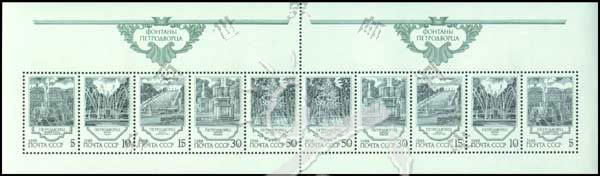 列宁格勒彼得宫的喷泉,参孙喷泉、亚当喷泉、金山喷泉、罗马喷泉群及小橡树喷泉雕刻版小版张(2套共10票)