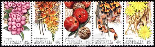 原住民食物,史密斯氏番樱桃(食果)、银桦树(食花)、澳大利亚檀香果(食果)、相思果(食种)及孟农(食块茎)5联(我社已售缺)