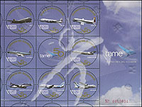 邮票介绍:厄军运航空公司成立50周年,道格拉斯DC-3型客机、DC-6B型客机、Airbus A320型商用客机及Art 42-500型双螺旋浆民航机圆形票小版张(8票)