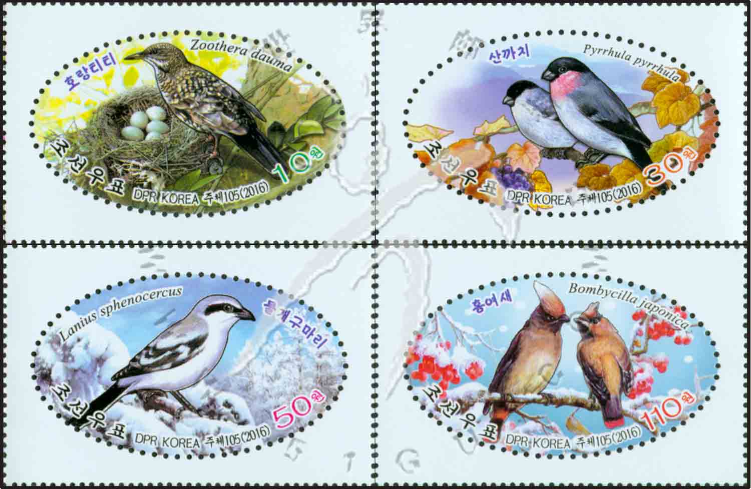 鸟类,虎斑地鸫、红腹灰雀、长尾灰伯劳及小太平鸟椭圆形票4全