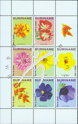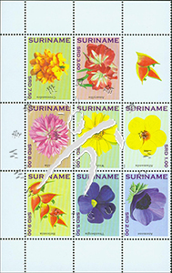 花卉,黄婵花属、银莲花属、蟛蜞菊属、蝎尾蕉属、天竺牡丹及黄鸟尾花8全带+1枚附票