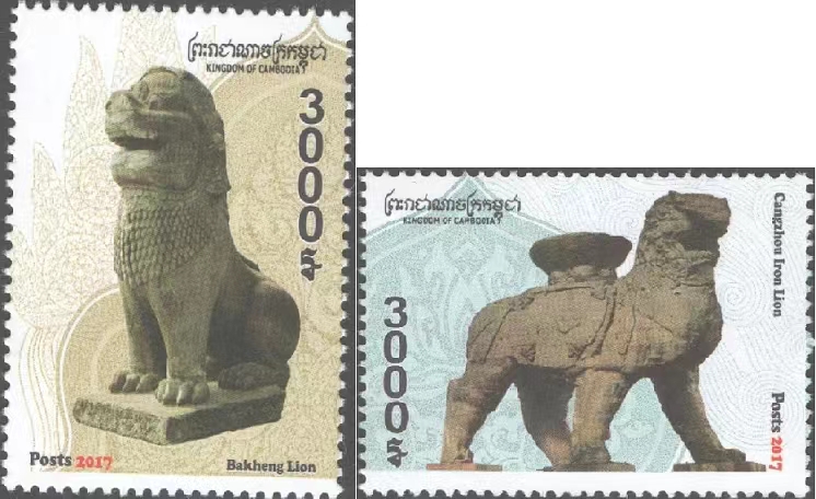 柬埔寨2017年与中国联合发行邮票2全沧州铁狮子和巴肯寺狮子