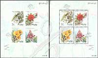 新年花卉,囊萼花、粉红树形杜鹃、鱼黄草及藤槐2枚小全张(有齿无齿小全张各1枚,各4票)
