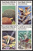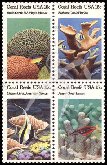 珊瑚礁,脑状礁、鹿角状礁、杯状礁及手指状礁4联