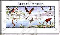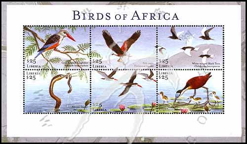 非洲鸟类三,灰头翠鸟、鱼鹰、白翅黑燕鸥、金枪鱼、黑剪嘴鸥、水雉小版张(6票)