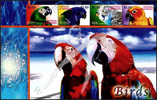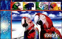 鸟类,栗额金刚鹦鹉、蓝头鹦鹉、虎丘鹦鹉、太阳鹦鹉小版张(4票)